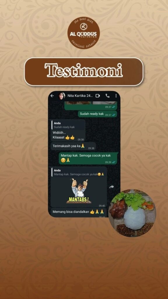 Di Al Quddus Catering, kami percaya bahwa makanan bukan hanya soal rasa, tetapi juga kepuasan dan kesan baik. Karena itu, kami selalu berusaha menjaga kualitas layanan mulai dari proses pemesanan yang mudah, komunikasi yang cepat, hingga pengantaran yang tepat waktu. Kepuasan pelanggan adalah prioritas kami, dan kami bangga menjadi bagian dari setiap momen berharga Anda.